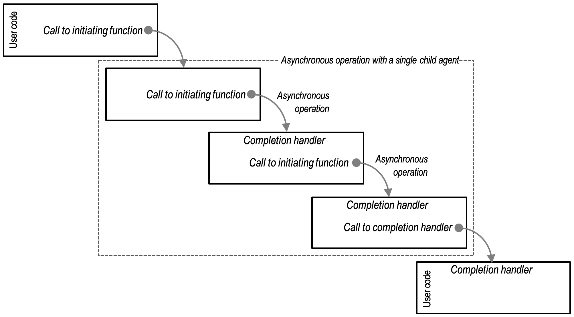 代理中的异步操作本身可以通过子代理来实现(在 Boost.Asio 中,这些异步操作被称为组成操作)。对于父代理而言,它只是在等待一个异步操作的完成。组成子代理的异步操作按顺序运行,当最后的完成处理程序执行时,父代理将恢复。